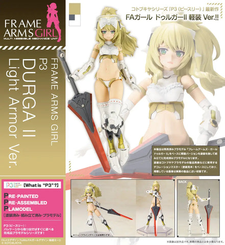Frame Arms Girl" Durga II joins Kotobukiya's "P3 (Pre-painted, Pre-assembled Plamodel)" lineup! The light-armor plastic model kit designed by ToMo and Eiji Komatsu is now available as a pre-painted, pre-assembled plastic model!