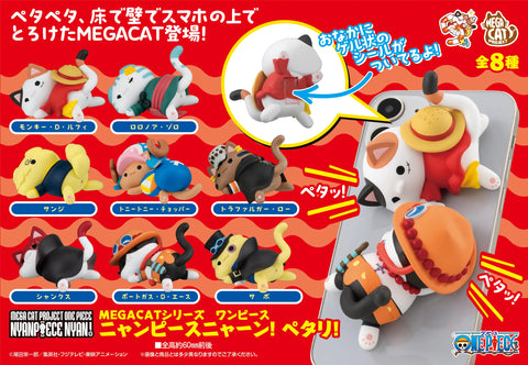 MegaHouse introduces their newest "Mega Cat Project" item -- your favorite "One Piece" characters as super-cute cats who've collapsed into a puddle of relaxation and contentment! Each figure has a gel-like sticker on its belly, so you can stick it to your favorite place; they're substantially sized, too, which makes them extra fun! There are eight different sleepy kitties to collect and trade, randomly packed in boxes of eight.