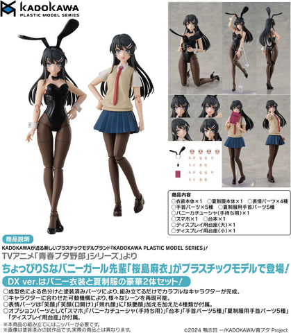 Mai Sakurajima from the "Rascal Does Not Dream" TV anime series joins Kadokawa's "Plastic Model Series" of action-figure model kits! This DX version includes parts to build a bunny-costume figure, and parts to build a figure wearing her summer uniform! She also comes with a smartphone, a bunny-ear headband that she can hold, a script, nine interchangeable hands for each figure, and bases for display.