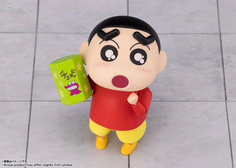 Shinnosuke Nohara, also known as the star of the popular TV anime "Crayon Shin-chan," is finally joining Bandai's "S.H. Figuarts" action-figure series! He's been perfectly sculpted to accurately represent his appearance in the anime, and he's articulated to get into any of his unique poses -- even sticking his butt out! He comes with interchangeable faces to recreate his many moods, as well as a figure of Action Mask, his favorite hero, and a box of his beloved Chocobi snack!