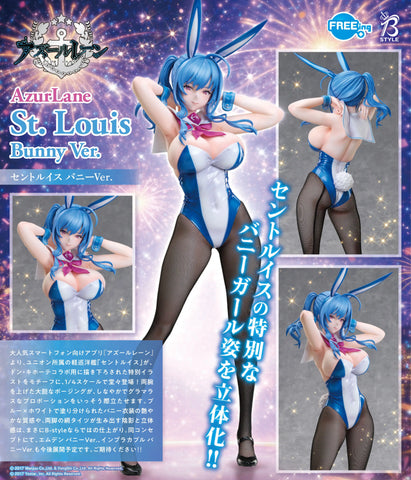 St. Louis, a Union heavy cruiser from the hit mobile app game "Azur Lane" is joining the "B-style" figure lineup from Freeing in an impressive 1/4-scale! This figure is based on a special illustration created for the Don Quijote collaboration! Her stunning physique is emphasized by the glossy blue-and-white bunny suit as she raises her arms to adjust her sailor collar with a smile. Her fishnet tights are made of real fabric, too, for a realistic look and feel! Her base is included.