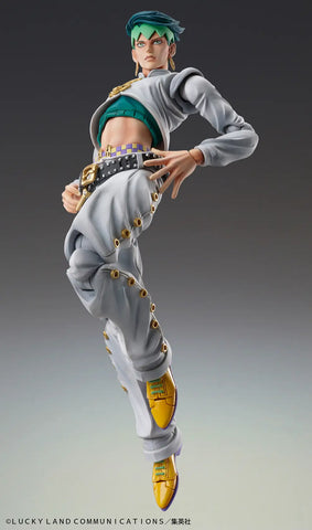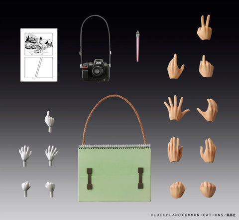 Green-haired manga artist Rohan Kishibe makes a triumphant return to Medicos' awesome "Super Action Statue" lineup, accompanied by his Stand, Heaven's Door! Both are in vivid colors as specified by their creator Hirohiko Araki, and each is super-posable for stylish attack moves! Rohan has two interchangeable faces, nine different hands, a page from his manga "Pink Dark no Shounen," a pen, camera, and sketchbook. Heaven's Door has five different hands.