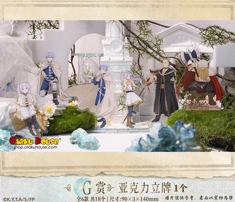 Detailed character acrylic stands featuring Frieren and the party in dynamic poses.