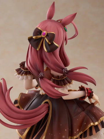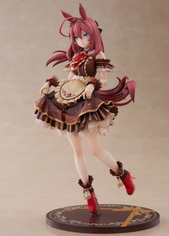Mihono Bourbon from the game "Uma Musume: Pretty Derby" gets a new figure from Claynel, wearing her "[CODE: ICING]" outfit, worn to celebrate Valentine's Day! The softly flowing layers of her skirt are richly expressed, with each frill and ruffle meticulously sculpted and painted. She wears a large ribbon bow on the back of her head, and her outfit is adorned with multiple brooches. The outfit's coloring combines the sweetness of chocolate with a chic elegance; the golden highlights really draw the eye! And you'll love her sweet, trusting smile, too. Her base is painted to resemble a box of chocolates, too!