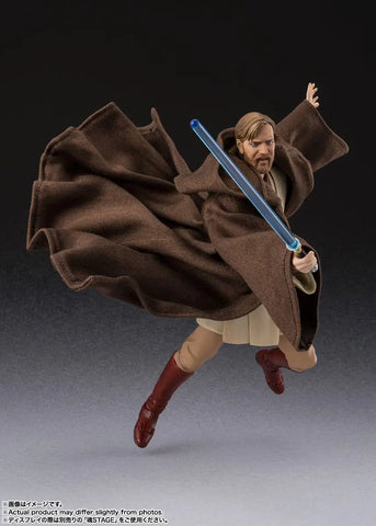 Obi-Wan Kenobi from "Star Wars Episode III: Revenge of the Sith" returns to Bandai's "S.H.Figuarts" action-figure series with a newly sculpted head and fabric cloak! The legendary Jedi Master who inherited the will of his late master Qui-Gon Jinn and guided Anakin Skywalker comes with his impressive cloak, and his newly sculpted head is a more accurate reproduction of his appearance in the film; the coloring has also been changed. An interchangeable face with a screaming expressions is included, and his fabric cloak features wires embedded in the hem for dramatic posing without interfering with movement! His regular lightsaber is included, as well as lightsaber effect parts to recreate battle scenes.