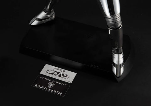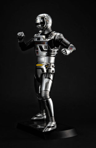 The original Space Sheriff Gavan, a fan favorite since his debut in 1982, returns to the Ultimate Article series with a 40cm big-scale figure featuring gleaming chrome plating and various electronic effects! The model features the "Combat Suit" from the series in all its glory, with all the details of his mask and suit captured in stunning detail, he features 25 LED lights all over the model together with sound effects that capture the spirit of the series perfectly. There are two settings that can be used - the first plays the classic "Space Sheriff Gavan (Instrumental)" music often heard in battle scenes while the Laser Scope lights up together with flashing lights on both his head and the Dimension Controller on his chest - all done in the image of the Vacuum Evaporation scene from the series. The second setting plays the "Gavan Dynamic" music from the climax scene while lights all over together with the Laser Blade on his right arm light up! An optional arm part allows the model to be displayed using the final attack with the Laser Blade in the climax of the series, and both a Laser Blade and a standard blade are included to switch between.
