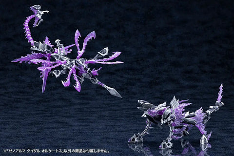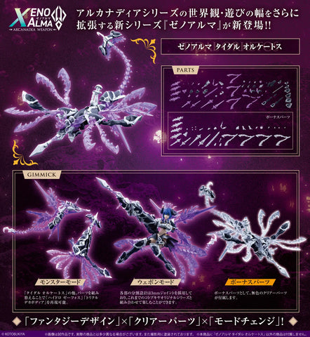 Tidal Orketos joins the "XenoAlma" lineup within Kotobukiya's "Arcanadea" series! By rearranging some of the parts, it can be constructed in its Monster Mode, and in three different Weapon Modes that transform it into weapons and armor that can be used by the "Arcanadea" Dears. You can also rearrange the parts to recreate Hydro Zephos and Trickle Decapodia! This item has been specially designed for compatibility with Velretta. The individual parts are designed with 3mm joints, so you can combine it with various "Arcanadea" characters, as well as figures from other original series by Kotobukiya. Bonus colorless clear parts are included too!