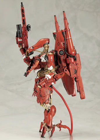 The commander's coloring is reproduced with molded-in colors; the model was designed by art director Yoji Shinkawa. Its weapons include a lightweight assault rifle, large heavy machine gun, shield unit, chiral particle cannon (left and right), close-combat arm (blade), missile launcher, power arm, and gas pod.
