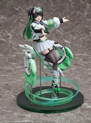 The fourth installment of the project is a 1/7-scale figure of Fuyuko Mayuzumi from the charasmatic idol unit Straylight, as seen in "The IdolM@ster: Shiny Colors"! Her outfit, based on her designated color, is an original AXGRIT design with futuristic details. The playful accessories, such as her cat-themed anti-gravity unit and her cat-ear visor with headphones, emphasize Fuyuko's charm. The flow of her hair, the details of her outfit, and her gentle smile with her arms outstretched are all meticulously sculpted, and delicate paintwork depicts the transparency of her stockings.