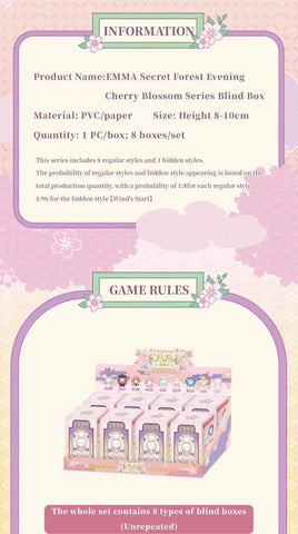 Discover the enchanting world of the "Unexplored Forest: Evening Cherry Blossom Party" with this blind box series by Emma. Each box offers a delightful surprise, capturing the magic and whimsy of a cherry blossom festival under the evening sky.