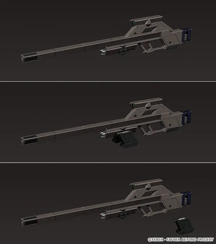 The model features fully articulated joints for posability after assembly, and interchangeable hands are included. The long-range Dragon Tooth rifle is included; the Dragon Tooth can be swapped out for a missile pod or monopod. The loading and unloading actions of the magazine, and the loading of a spare magazine, are faithfully recreated. Interchangeable parts also allow for the deployment of its aiming system and the extension of its monopod.