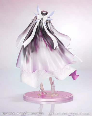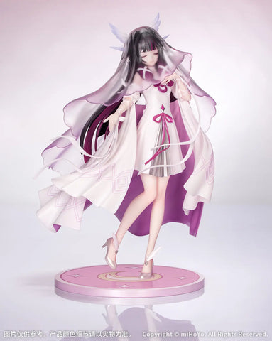 The "Carnival Gathering" version of Columbina from the game "Genshin Impact" joins the "Gift+" figure series from Myethos! Her pure white dress is simple yet elegant, and her transparent veil is removable; the delicate matte pattern on its surface emphasizes her delicate beauty. The surface of her softly fluttering cloak is adorned with fine glitter scattered like stars, with the lining bathed in a soft, dreamy gradient from pink to purple. The ribbon tangled around her arm flutters in the breeze, and her eyes are blissfully closed, as if she hears music.