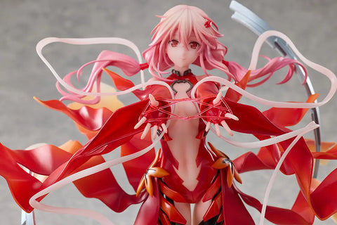 The figure is based on the memorable scene of Inori with her arms outstretched, holding the Cat's Cradle. Her long, cherry blossom-colored hair flows softly in the breeze, and her goldfish-inspired outfit features a gradated color scheme shading from crimson to orange, highlighting its airy frills which look like swaying fins underwater! Her base is inspired by the Void Effect from the series, with the silver frame and parts intertwining to create an impressive display.