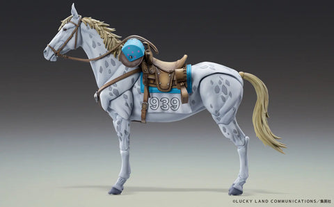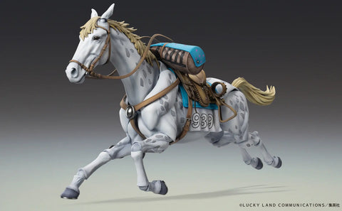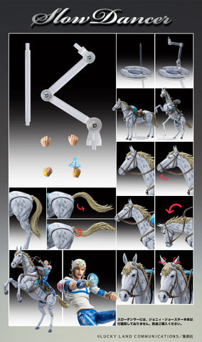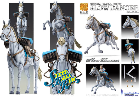 Slow Dancer from "JoJo's Bizarre Adventure Part 7: Steel Ball Run" finally joins the "Super Action Statue" lineup from Medicos! The musculature and skin texture are expressed through meticulous sculpting and painting, accurately reproducing Slow Dancer's spotted pattern and even the smallest details. The legs, tail, and ears are all articulated for dynamic and lively poses, and multiple interchangeable hands for Johnny Joestar are included. Effect parts are also included to recreate the attack where Johnny's Stand, Tusk Act 2, rotates like a drill, as are parts to recreate Johnny riding Slow Dancer and holding the reins! A base for display is included.