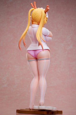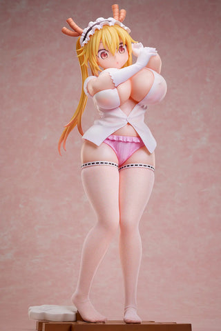 Tohru from the TV anime "Miss Kobayashi's Dragon Maid" is now a delightfully detailed 1/4-scale figure from A Dimension! This figure is based on an illustration by Cool Kyou Shinja, and shows Tohru wearing a white blouse and pink underwear. Her voluptuous figure is almost too much for the tiny, tight shirt to contain! Her twin-tail hairstyle is carefully sculpted and painted, and her white fishnet stockings are made of real fabric for a realistic look and feel; you'll love her adorable expression, too! Her maid's headdress and her dragon horns are also recreated with great care. She comes with a base, too.